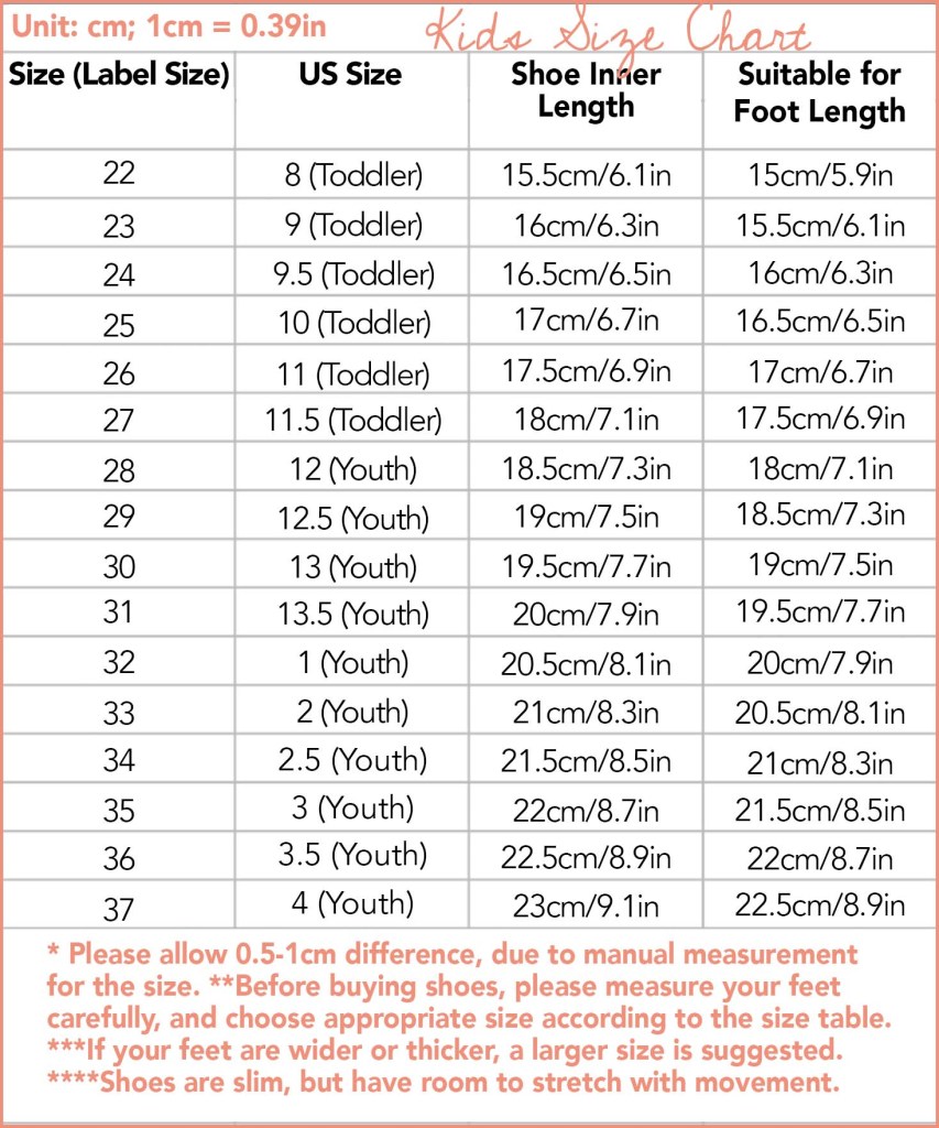 (Note: Expect normal wear and tear from kids’/grown-ups’ usage! Wash separately. Measure feet carefully and according to accommodating size chart below…Lugz & Vans shoes have a longer turn-around time. International rates are to be determined.)